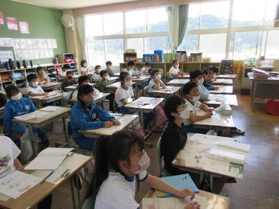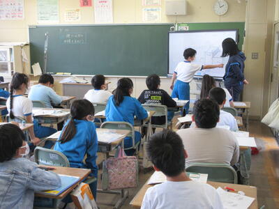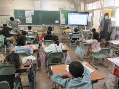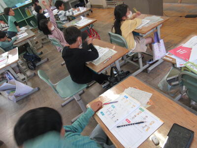 4年生は社会の授業、都道府県の学習です。県の形を見て、県名をあてます。夢中で考えていました。答えが出ない時は、ヒントを出します。例えば、①鹿苑寺(金閣)があります。②清水寺があります。③滋賀県の近くです。④県ではありませんで、京都府と正解しました。形で分かりやすい県、難しい県ありますね。