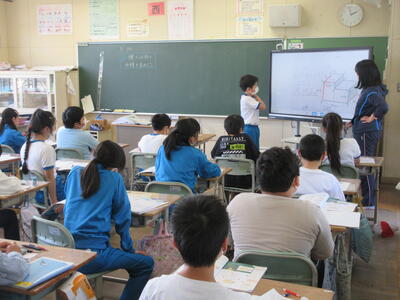 5年生は算数の授業、複雑な形の体積を求めていました。いくつかの直方体に分け、足し算や引き算を使って計算します。お友達に説明したり、説明を聞き取ったりすることにより、理解が深まりますね。