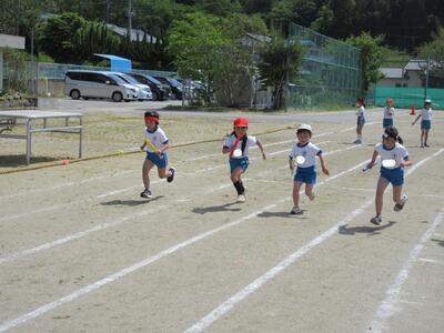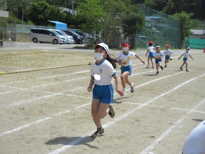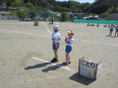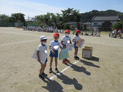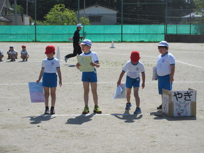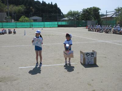 まず、前半では、全員で開会式とラジオ体操を行い、続いて、低学年のチャンス走「イントロクイズ」、低学年の「かけっこ」の練習をしました。チャンス走は、小鳥、ちょうちょう、あり、やぎのの道具から1つを選び、道具にあった音楽が流れたら、そのままゴールできます。どの道具を選ぶかで、大きく順位が変わります。選んだ道具の曲が流れるのを信じてください。