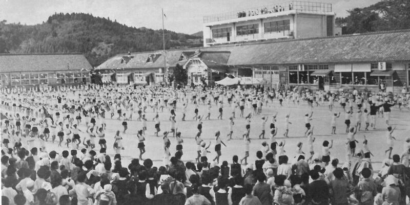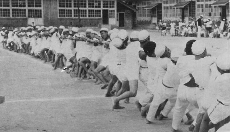 ここで、過去の運動会を紹介します。昭和37年(1962年)の運動会は、秋に行っていました。6年生は、今年で73歳の方です。木造校舎の前で「子供磐梯山」を踊っています。定番の紅白綱引きも行っています。