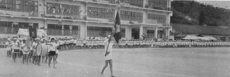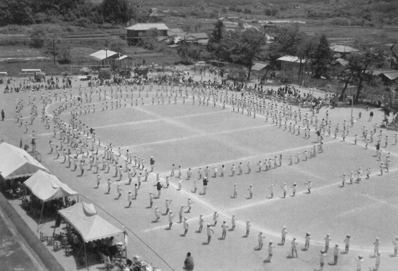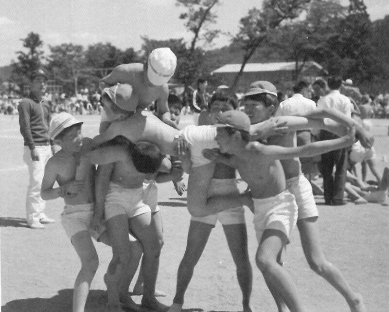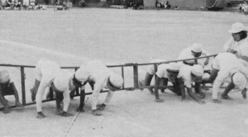 続いて、昭和40年(1965年)の運動会も、秋に行っていました。鼓笛隊が行進しています。約60年の歴史があるのですね。ハシゴくぐりなど変わった競技がありました。