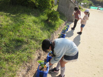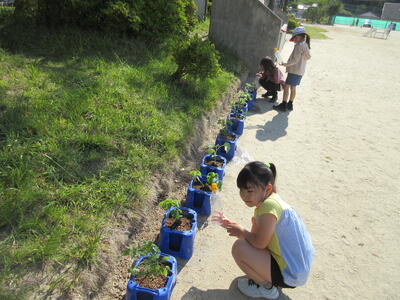 2年生が、生活科で植えた野菜の苗に水をやっていました。「これ何かわかりますか。」「豆かな?」「教えてあげる。枝豆です。」その他、ミニトマト、キュウリなども育てています。これからの成長が楽しみですね。