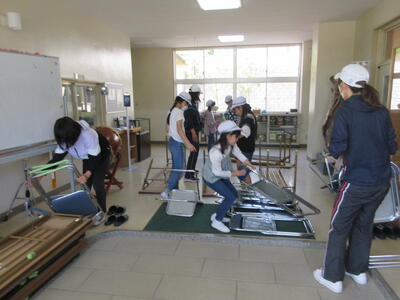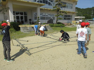 令和5年5月12日(金)の5校時、5・6年の児童と職員で運動会の準備をしました。テントの骨組みを作ったり、校庭の石拾いや除草、観覧席の区切りの杭を打ったり、テーブルやいすなどを運んだりしました。