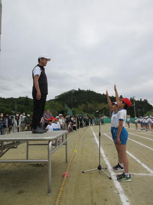 開会式では、開式の言葉の後、国旗掲揚、優勝杯返還を行いました。子どもたちには、校長より、「最後まで全力を出して頑張りましょう。全力を出す姿は、どんな結果でもかっこいい。お友だちを励まし、応援しましょう。全力を出すお友だちに拍手を送ってほしい。150周年にふさわしい、思い出に残る、素晴らしい運動会にしましょう。」と伝えました。また、PTA会長様から、励ましのお話をいただきました。続いて、演技上の注意、代表生徒による誓いの言葉の発表があり、開会式が終わりました。