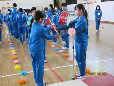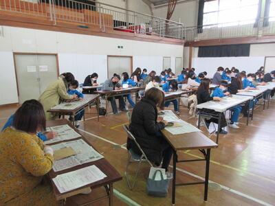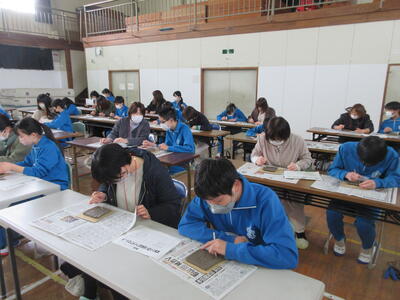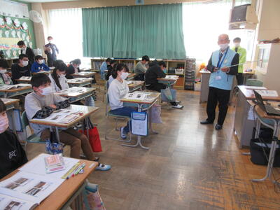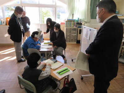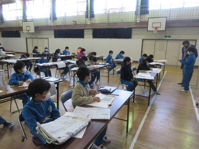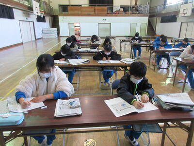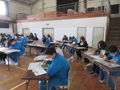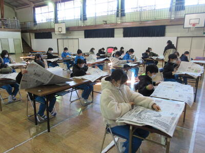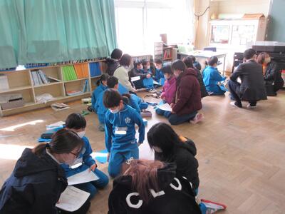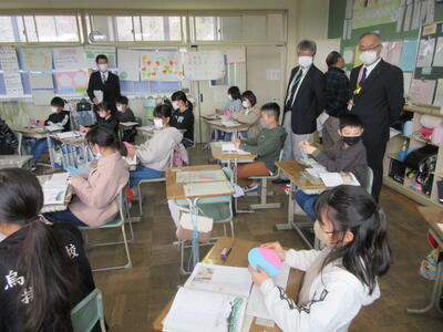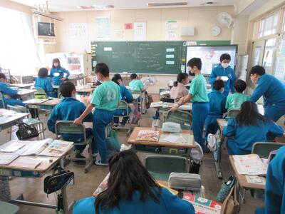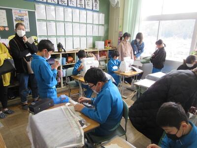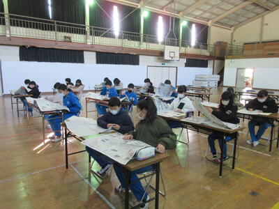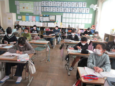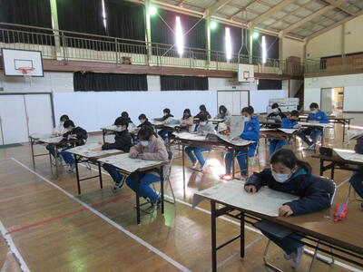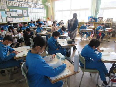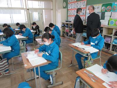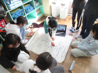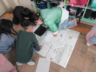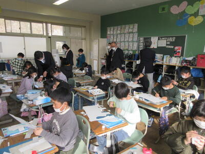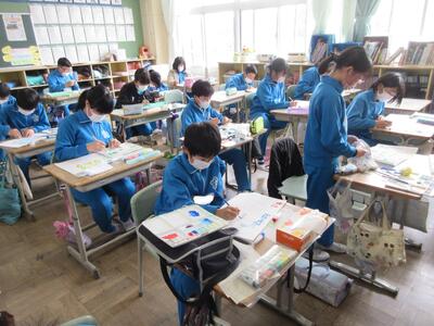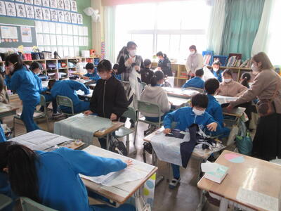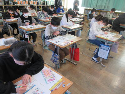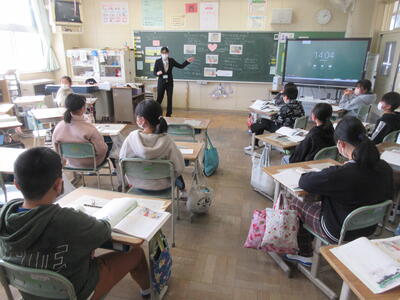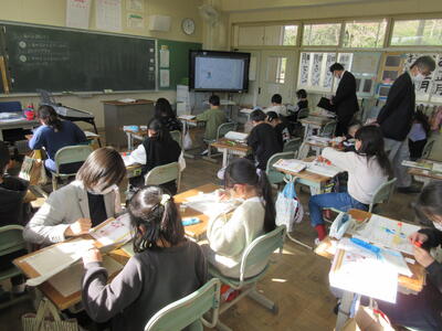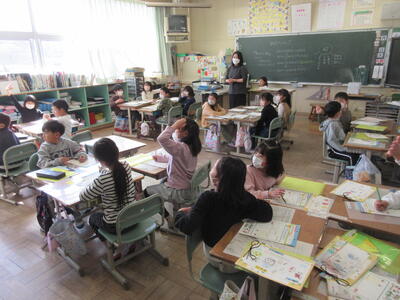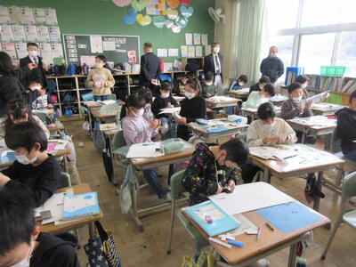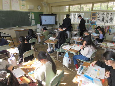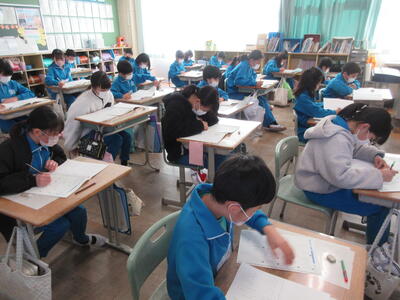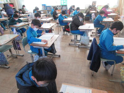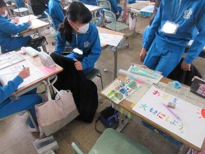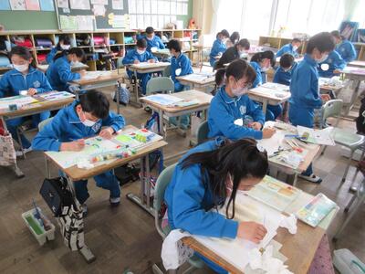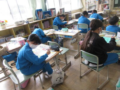 5年生は、美術「伝え合いたい思い」でした。好きな場所を選び、そこにあう大切なことをメッセージにします。音楽室では、「楽器を大切にしよう」、花壇では、「植物を大切にしよう」など、それぞれの思いが表現されていました。