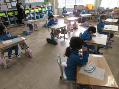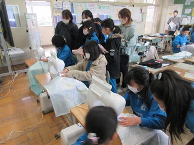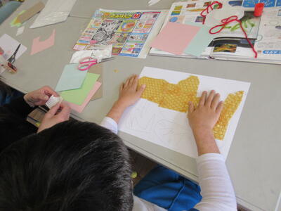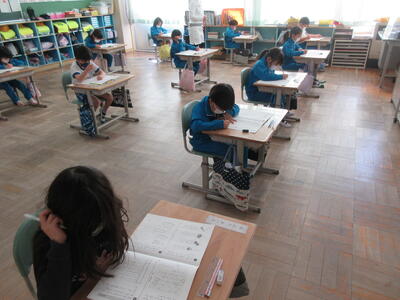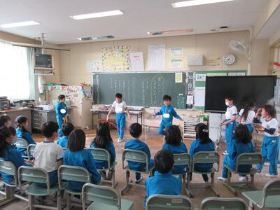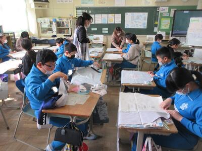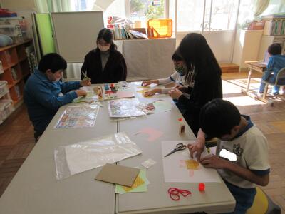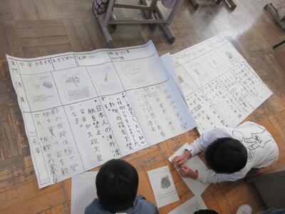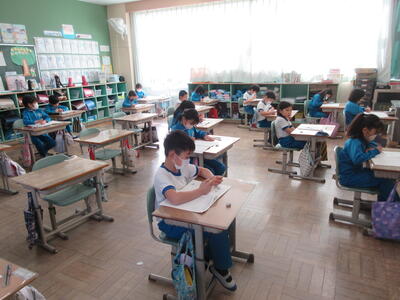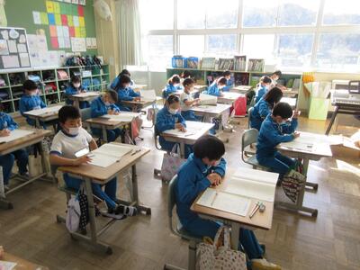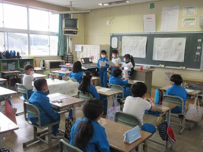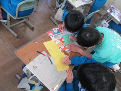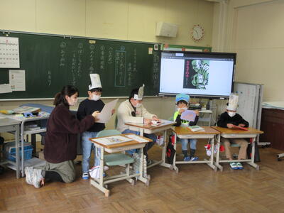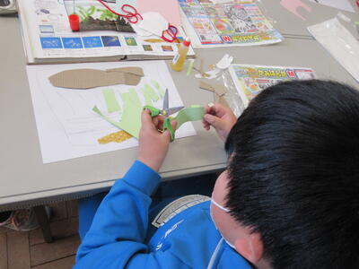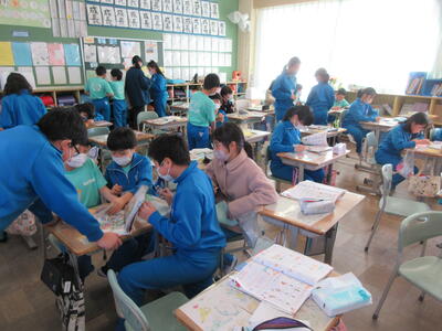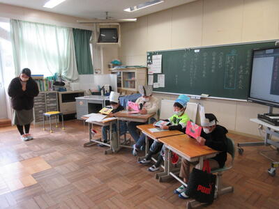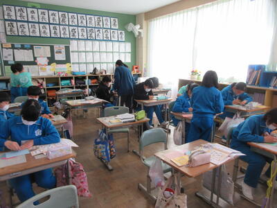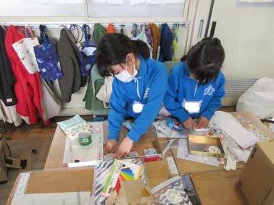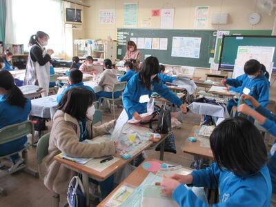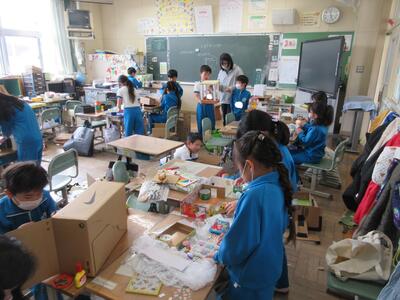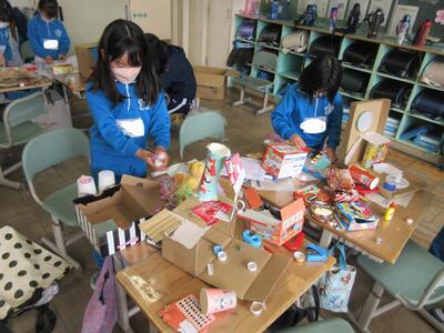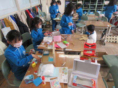 2年生は、図工「小さな友だちハウス」でした。紙ねん土や貝、石などを小さな友だちに見立て、箱でお家を作っていました。家の中には、お部屋、ベット、…イメージが広がります。