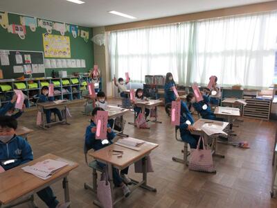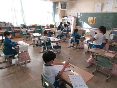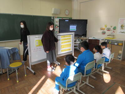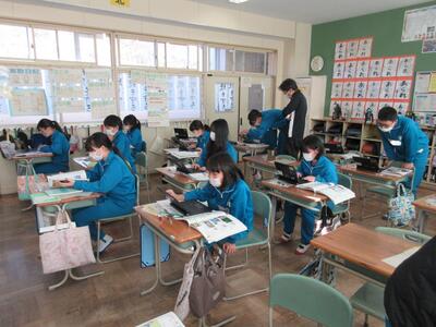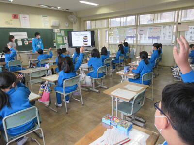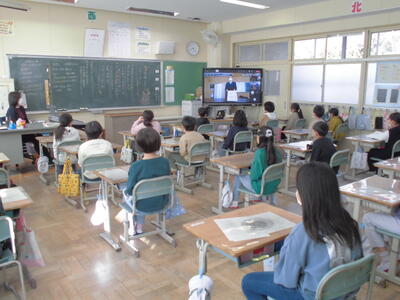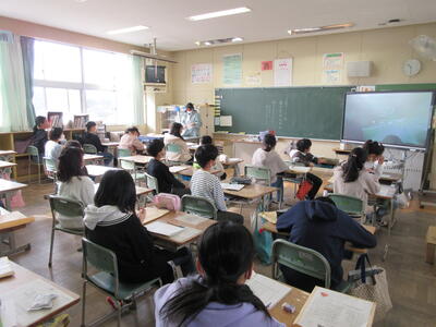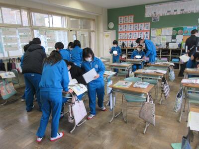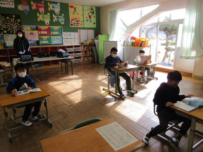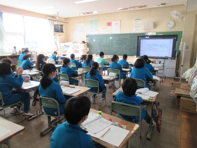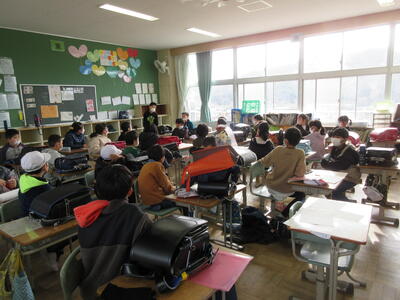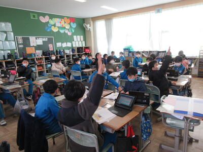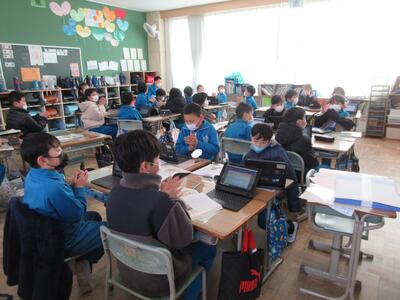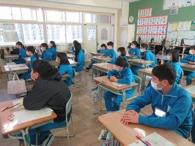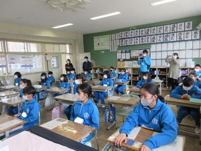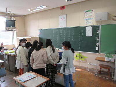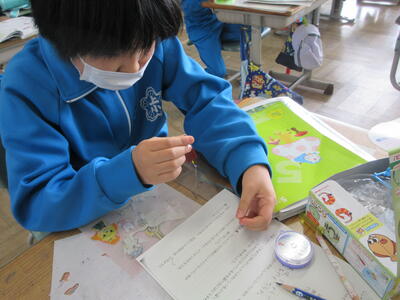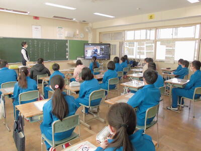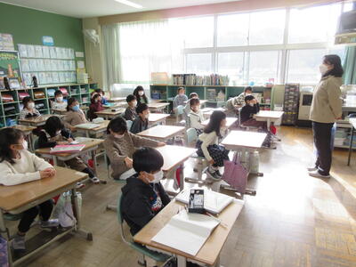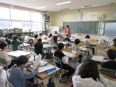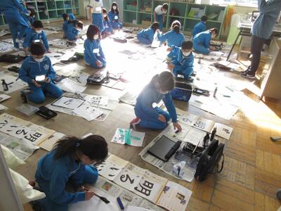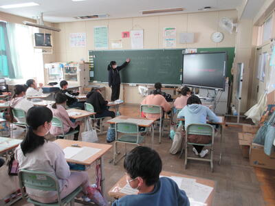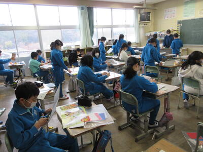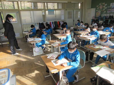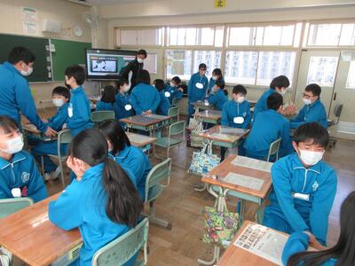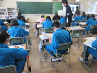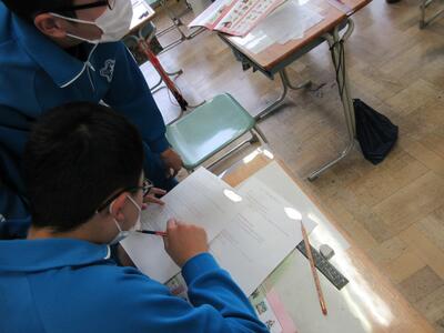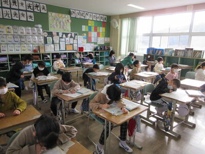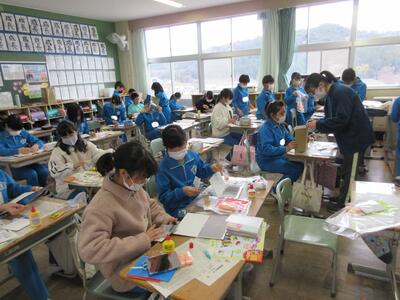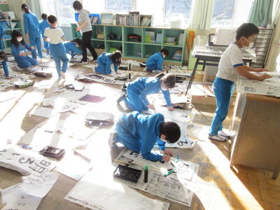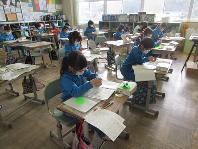 令和5年1月16日(月)、5年生は図工の授業「ミラクル、ミラーステージの制作」でした。ミラー工作用紙を使って、広がりある作品を作ることができます。今後の進み具合に期待します。 6年生は、ALTの先生と外国語(英語)の授業。結構な分量の会話文を読解していました。「What's your best memory,Emily?(エミリー、最高の思い出は何)」「My best memory is our school trip.(修学旅行)」… 分かるところは赤でアンダーライン、分からないところは青でアンダーラインした後、グループで確認していました。