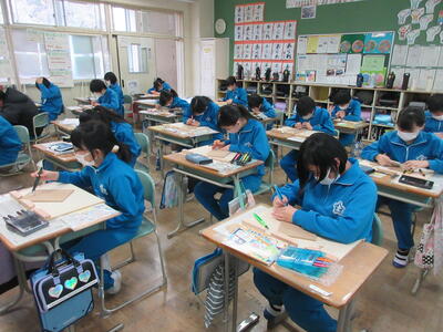 4年生は書写、校内書き初め会に向けた練習を2クラスに分けて行いました。題は「美しい空」です。前半は題を2つに分けて半紙に練習し、後半は合わせて書き初め用紙に書きました。書道でお正月が近づくのを感じます。