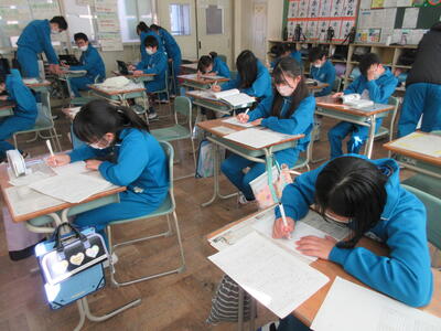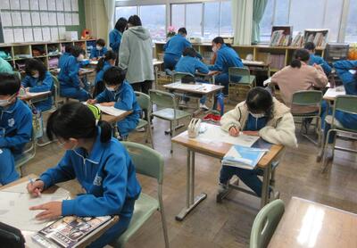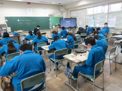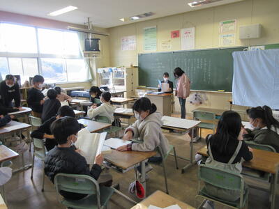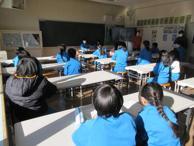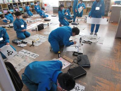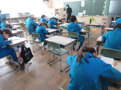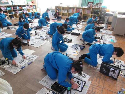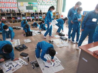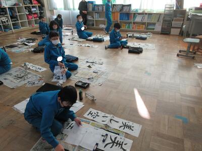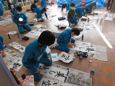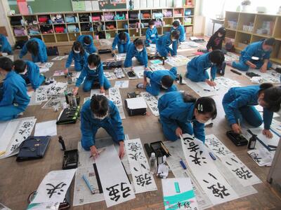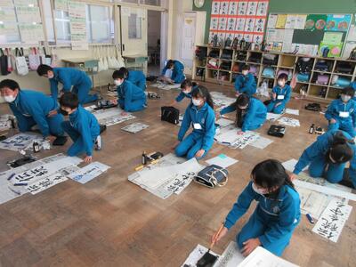 6年生は書写、校内書き初め会に向けた練習をしていました。題は「伝統を守る」です。床に正座しての書道、書き初めの雰囲気が出ます。清書は1月の予定です。