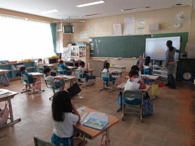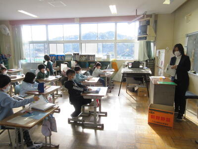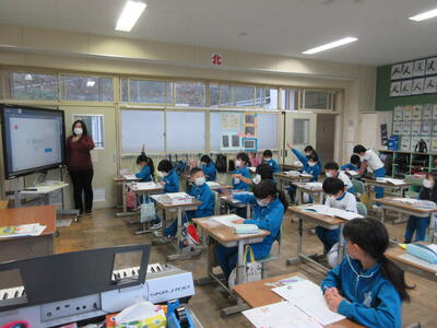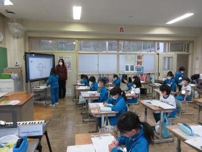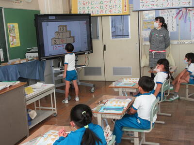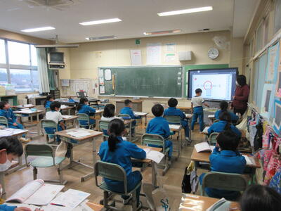 令和4年12月22日(木)、3年生は算数「おぼえているかな?」、今まで学習したことの復習です。小数の足し算や引き算、そして、電子黒板を使って、あまりのあるわり算を勉強していました。正解すると自動で丸がつき、みんなの前で解きたい児童がたくさんいました。