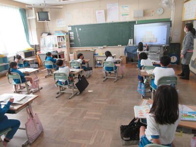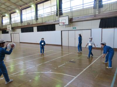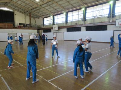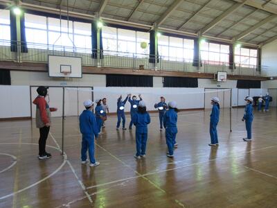 3年生は体育、ネットを挟んだボールゲームです。まず、チームごとにサーブ、レシーブの練習をしていました。そして、ゲームに挑戦。ちなみに、ボールは、けがをしないように柔らかいボールでした。