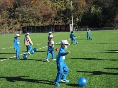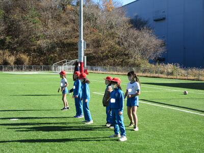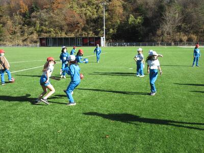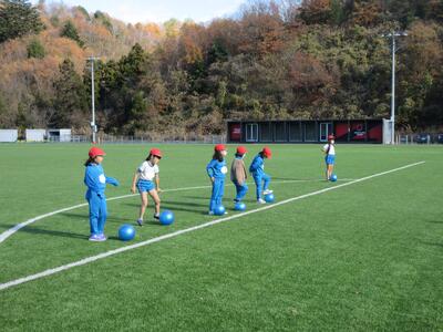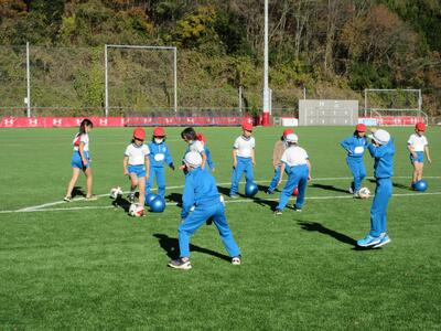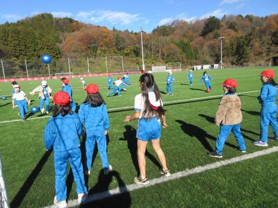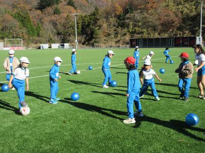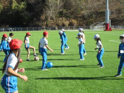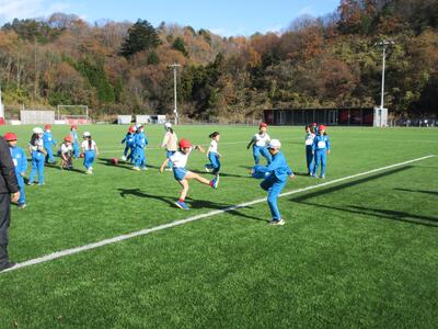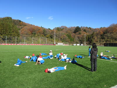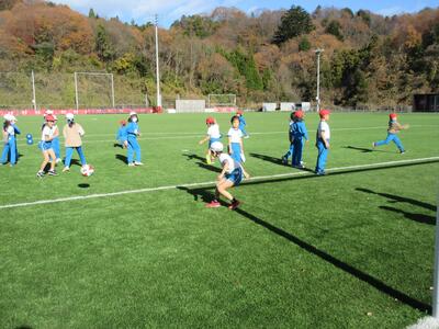 いわきFCでは、選手の方とも交流でき、一緒にサッカーを楽しむことができました。また、ボールゲームとして、攻撃チーム、ガードチーム、ゴールチームに分かれ、気持ちよく体を動かしました。天候にも恵まれ、満足した時間を過ごすことができました。