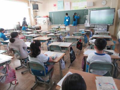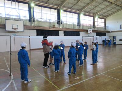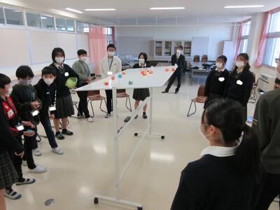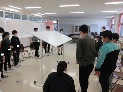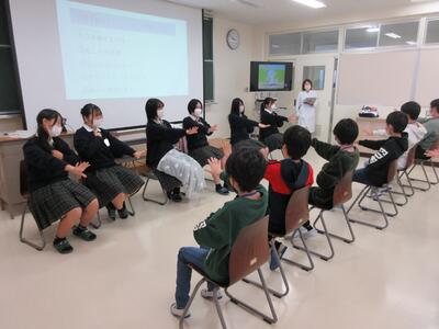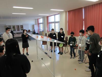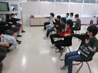 男子児童は、福祉分野、「介護予防レクリエーションの実践」です。生活科学科の生徒は、高齢者施設で実習を行い、高齢者とのふれ合いや様々な活動をするそうです。今回体験したのは、①もしかめ体操、②ジャンケンリレー、③ホワイトボードバランス、④脳トレ問題にチャレンジでした。