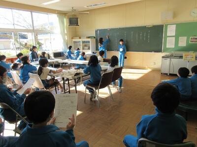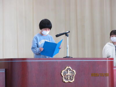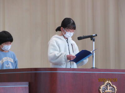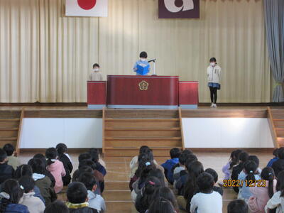 令和4年12月23日(金)、第2学期終業式で、2学期の反省と冬休み・3学期の抱負について、1年生、3年生、5年生の代表児童が、「心に残ったあすかい発表会、緊張したけど、上手にできてうれしかった。冬休みは、楽しいことをしたい、お勉強も頑張りたい。」「頑張ったことは、算数の計算と持久走です。体力をつけて、もっと速く長く走れるようになりたい。」「算数は、先生の話を聞いてできるようになったらすごく楽しい。宿泊訓練で班長となり、安全に活動できた。冬休みは、進んでおそうじのお手伝いをしたい。」と発表しました。