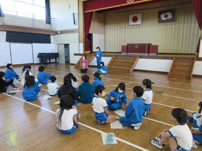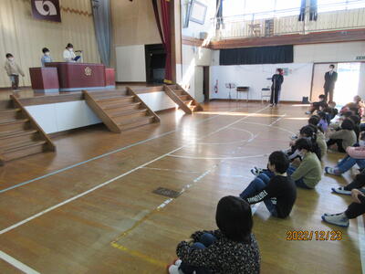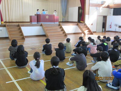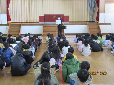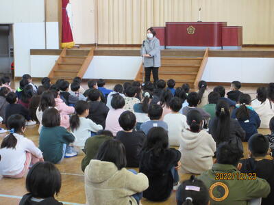 式の後、生活指導主事が、子どもたちが楽しく、安全に冬休みを過ごせるよう、次の話をしました。①学習時間。②早寝・早起き。③ゲームは夜9時から朝7まではしない。④ゲームコーナー、映画館は、お家の人と。⑤交通事故防止(止まる・見る・待つ)⑥不審者対応(イカ・の・お・す・し)などです。ご家庭でも、お子さんとご確認ください。また、養護教諭が、病気にならない、新型コロナ、インフルエンザ対策には、手洗い、消毒、マスクが大切なことを説明しました。