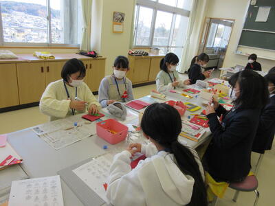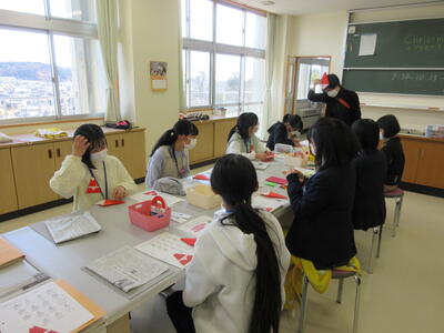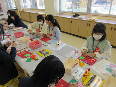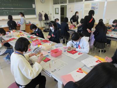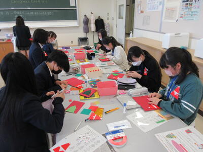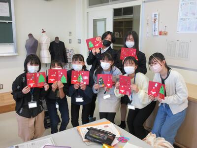 女子児童は「クリスマスカードの作成」です。生活科学科では、「教養ある社会人」になるために必要な知識や技術、マナーや一般常識について勉強しているそうで、毎月、季節にちなんだ行事等の学習をしています。そのため、12月の今回は、クリスマスについて楽しく学ぶこととなりました。
