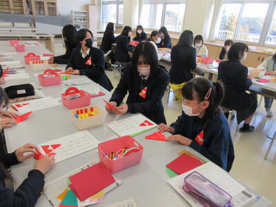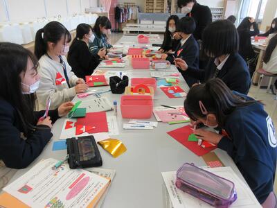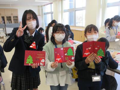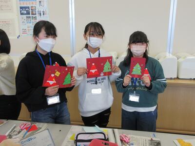 折り紙で折ったサンタクロースやフェルトのクリスマスツリーをカードに貼り、さらに、折り紙やペンで、様々な飾り付けをしました。高校生に優しく話しかけてもらい、安心して、カードの作成をすることができました。90分の体験時間があっという間に過ぎ、素敵なカードの完成となりました。担当した先生からは、「限られた時間の中で物事を達成すること、完成させることを大切にしてほしい。」と助言をいただきました。