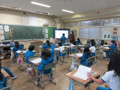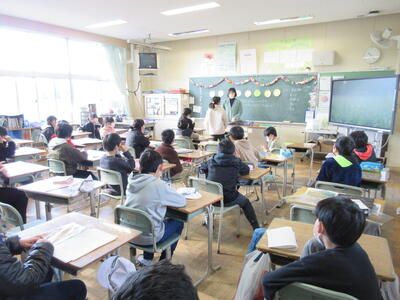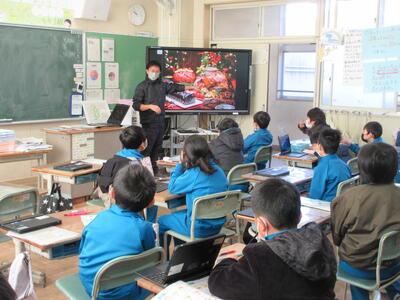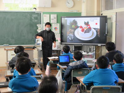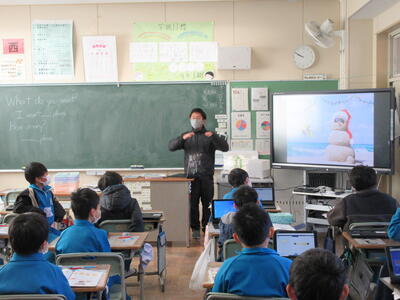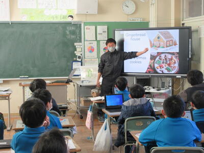 令和4年12月19日(月)、4年生はALTとの外国語活動です。授業の後半に、クリスマスについての説明を受けていました。日本でクリスマスといえば、冬のイメージですが、ハワイは夏のクリスマスです。ちなみに、私たちにとって、クリスマスケーキとチキンが定番ですが、アメリカではケーキを食べる習慣はないそうです。欠かせない料理は七面鳥の丸焼きで、クッキーを食べるそうです。子どもたちは、映像を見ながら説明を聞き、とても楽しい気持ちになったようでした。