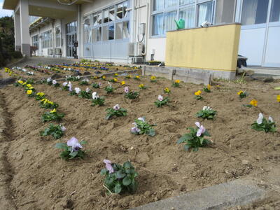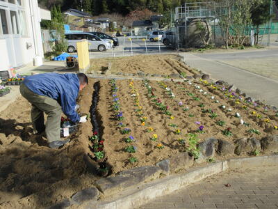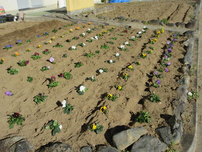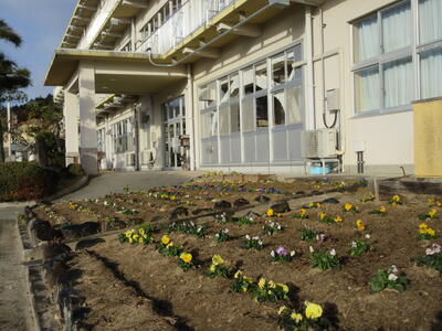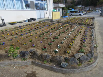 令和4年12月16日(金)と19日(月)にお二人の用務員さんが、花壇を整備してくれました。緑化環境整備のために遠野支所よりいただいた300株のパンジーの苗です。花壇が急に明るくなりました。冬から春、初夏まで楽しめそうです。