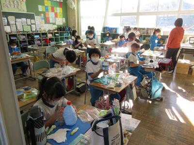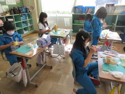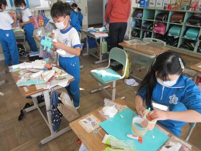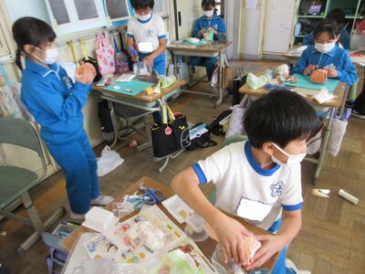 令和4年12月20日(火)、3年生は図工、「空きようきのへんしん」です。空き容器と絵の具で色を付けた紙粘土を使い、貯金箱や鉛筆立てなどの小物入れをつくっていました。形のデザインは、ペンギンやカメレオン、恐竜など、アイディア豊富です。