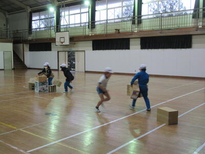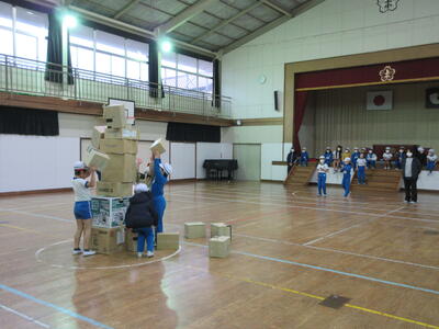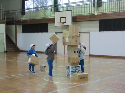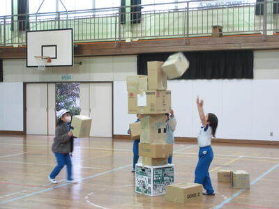 2年生は体育「段ボールを積もう」、チーム対抗で、決まった時間内に何個の段ボールを積めるか競い合っていました。知力、体力、チーム力の戦いです。楽しみながら、運動しています。