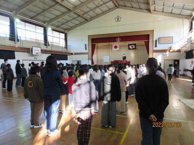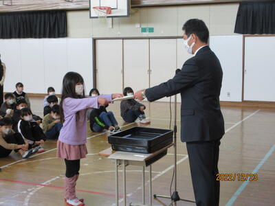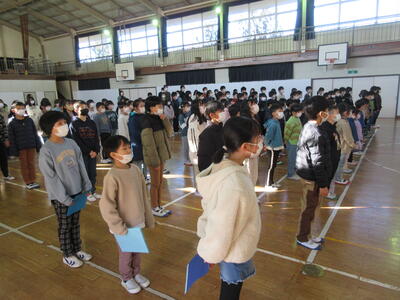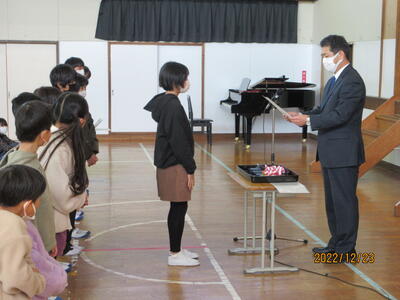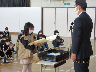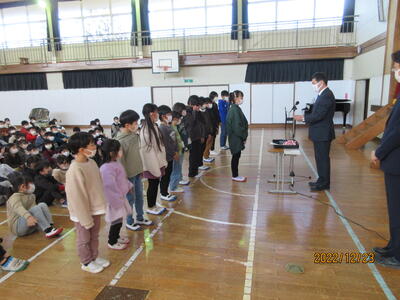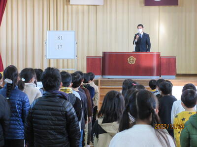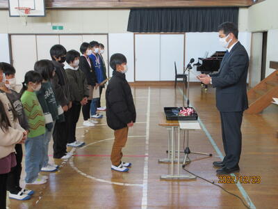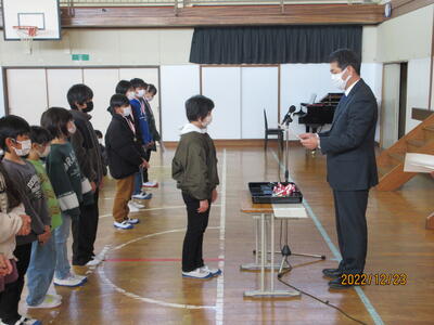 式では、校長が、節目の行事ごとに目標を持ち、自分を成長させたことを称賛しました。行事、毎日の生活で頑張ったことを思い出し、自分で自分をほめ、3学期も続けてほしいと話をしました。また、17日間の冬休みには、冬休みにしかできないことをし、交通事故に遭わないようにしてほしい、新鮮な気持ちの年の初めに、新年の目標を立ててほしいと話をしました。