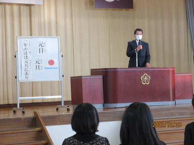 児童の皆さん、安全で、充実した冬休みを過ごし、3学期の始業式で元気に会いましょう。「1年の計は元旦にあり」ぜひ、新年の目標や計画を心に決めてください。保護者の皆様、2学期間、ご協力ありがとうございました。冬休みの間、よろしくお願いいたします。