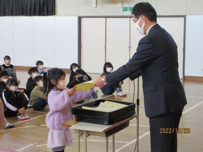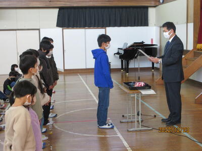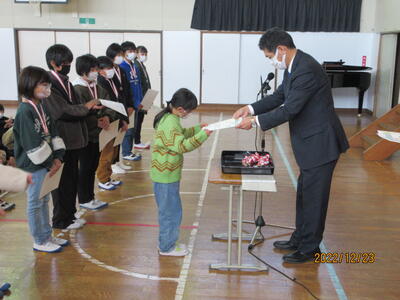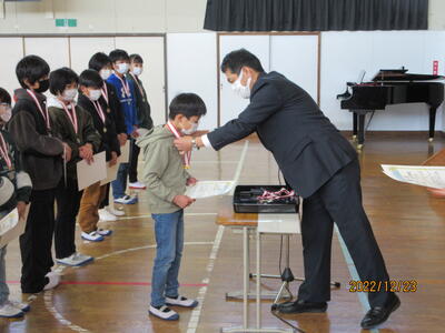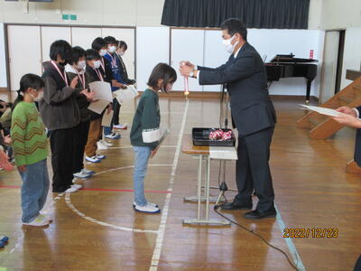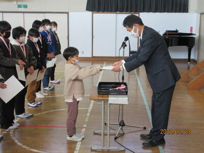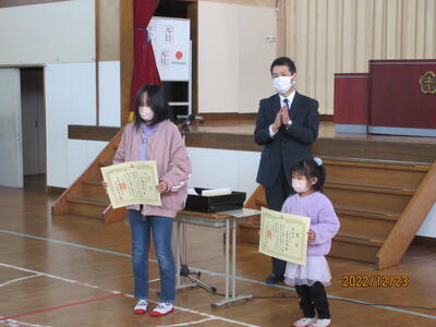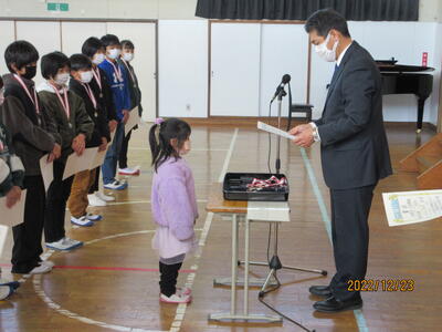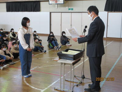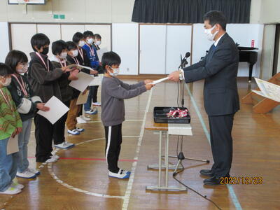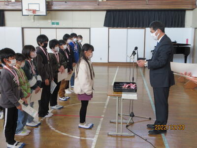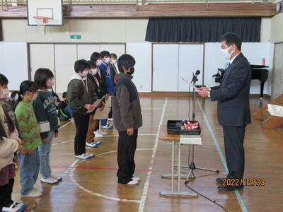 令和4年12月23日(金)、第2学期終業式後、各種表彰を行いました。JA書道コンクール、税の書道展、木工工作コンクール、いわき児童造形展覧会です。また、持久走記録会の各学年男女1位の児童に記録証とメダルを渡しました。