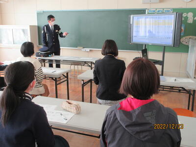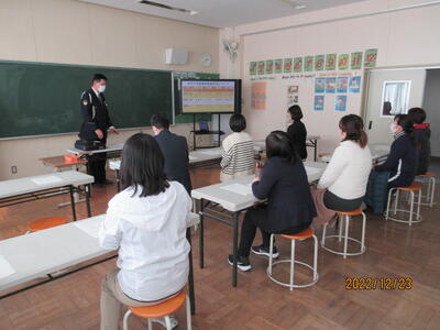 令和4年12月23日(金)、9回目の校内服務倫理委員会全体会を開催しました。この会は、私たち教職員が教育公務員としての職責を自覚し、本校から不祥事を絶対に起こさないために、テーマを変えながら実施しています。今回は、近頃、いわき地区で交通事故が多数発生している現状と冬特有の事故が心配されることから、率先して交通事故防止に取り組むため、いわき南警察署の交通係長さんを講師に研修を行いました。いわき市の交通事故の現状やその特徴、事故防止策について詳しく説明をいただきました。