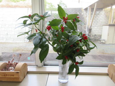 令和5年1月10日(火)、支援員の先生が、玄関に花を飾ってくれました。お正月飾りによく見られる「千両」です。ちなみに、花言葉は、「利益」「裕福」「財産」「恵まれた才能」などです。児童の皆さんの才能が花開き、実ることを願っています。