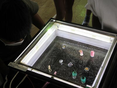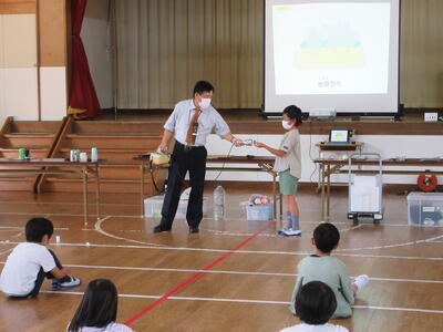 昔生きていた生き物が化石になるまで、どのくらいの年月がかかるかという質問から始まり、化石のでき方や地層、水の力で流されてたい積してできた岩石(れき岩、砂岩、でい岩)について、写真や実物を提示しながら、説明いただきました。