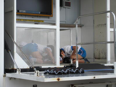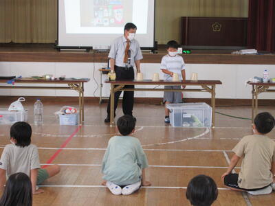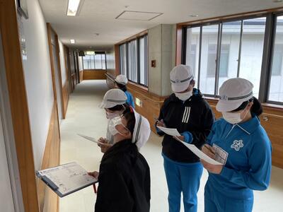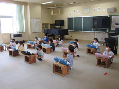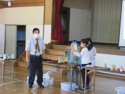 まず初めに、避難方法として、頭を机の下に隠し、しっかりと机の脚につかまる姿勢を学んだ後、けが防止のプロテクターを膝に付け、震度6や5の地震を体験しました。子どもたちは、揺れの大きさに驚くとともに、正しい避難姿勢の大切さを実感できたようです。その他、地震発生の仕組みやアクアマリンやイオン小名浜店を例に津波が発生したときの避難方法について、説明を受けました。子どもたちにとって、印象に残る体験になったようです。
