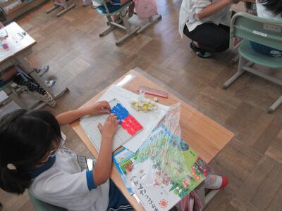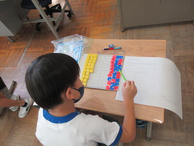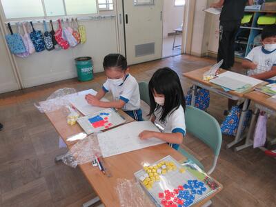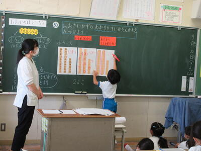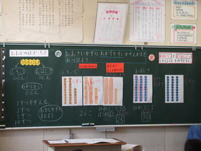 本時の授業は、大きい数の、分かりやすい数え方を見つける学習です。ブロックとおはじきが入った2つの袋を提示し、「おおいのはどっち?」と問いかけたことにより、子どもたちは問題に興味を持ち、解決したいという気持ちが高まったようです。問題を解決する場面では、1つずつ数える、2つずつ数える、5つずつ数える、10ずつ数えるなど、自分の考えを持ち、図や言葉を使って説明する経験を大切にさせました。子どもたちからは、「自分の考えを書くのは楽しい。」という意見が出ました。最後に、10でまとめると分かりやすいということで、授業のまとめとなりました。