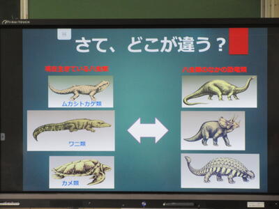 また、全国的に有名で、アニメや記念切手になっているいわきで発掘された「フタバスズキリュウ」についても丁寧に説明いただきました。話題は、石炭、は虫類と恐竜の違い、恐竜は鳥という学説、進化の話まで広がり、子どもたちは大変喜んでお話を聞いていました。授業の最後には、本物のシーラカンスの化石を間近で見たり、始祖鳥のレプリカに触れたりして、さらに興味が高まったようでした。