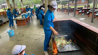 5年生は現在、野外炊飯を行なっています。薪に火をつけて野菜を切り、焼きそばを作ります。どの班もおいしくできたようです。