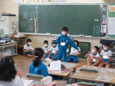 令和4年10月13日(木)、2年生は、あすかい発表会の準備をしていました。劇の希望する配役ごとに、セリフを試していました。例えば、「オレたち、水中のブルドーザーだよ。元気一杯の伊勢エビだぞ。シャキーン。」「オレたちは、うなぎさ。…」セリフの言い方やポーズを工夫しながら、行っていました。