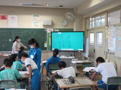 5年生は、算数の授業、通分の学習でした。分母の最小公倍数を見つけることがポイントです。先生問題を解いた後は、友達が考えたオリジナル問題に挑戦していました。