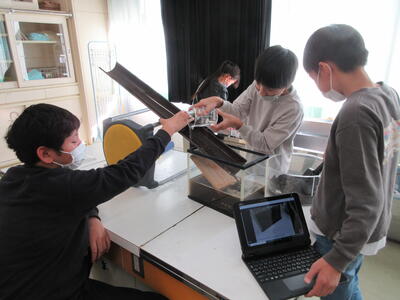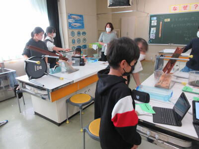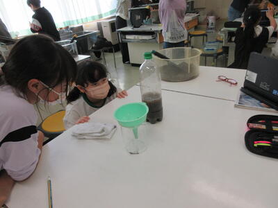 令和4年10月14日(金)、6年生は、理科の授業、「土を水の中に流し込んで、層ができるか調べよう。」を実験していました。実験は、理科室にある物を使いましたが、方法は児童が考えたそうです。小石や砂、泥が混じった土を雨樋を使って水で流したり、土と水をペットボトルに入れよく混ぜたりして、沈む様子を観察しました。興味を持って取り組み、実験の結果をタブレットで記録していました。先週の「ほるる」出前授業で学習した内容が思い出されます。