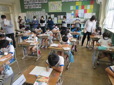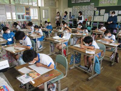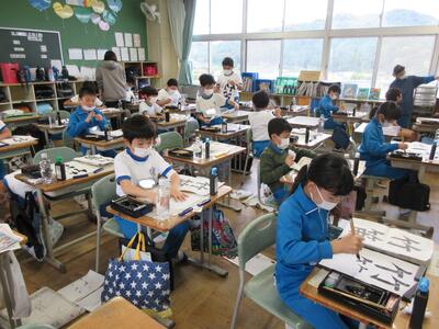 4年生は書写の授業、作品は「竹笛」です。止めと払いに注意して、しっかりとした字を書いています。よい出来映えに、満足な表情です。