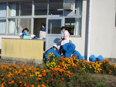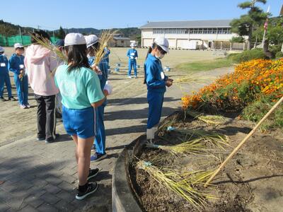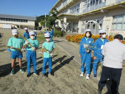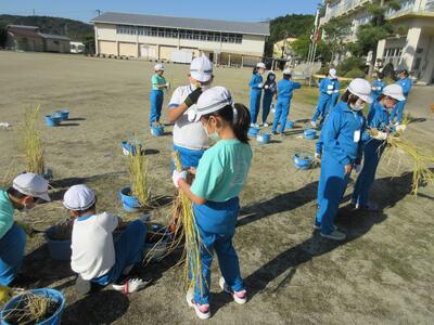 令和4年10月21日(金)、5年生がバケツ稲の稲刈りをしました。 水をやらず、乾かしておいた稲をはさみを使って、刈りました。刈り取った穂は、根元を縛り、干します。一部、スズメに食べられた穂もありましたが、よい経験になったと思います。使ったバケツは、洗って、学校で再利用します。