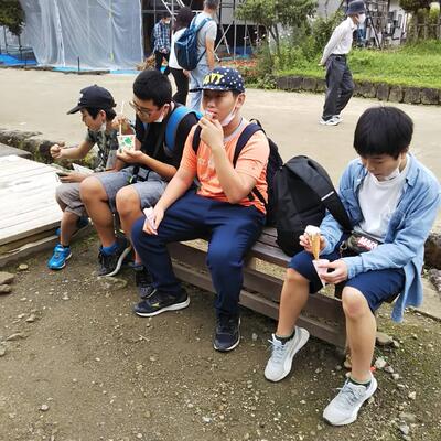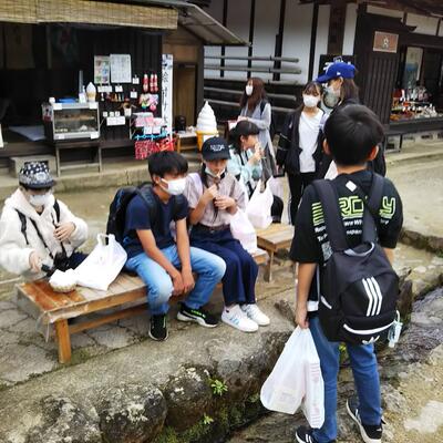 6年生は、現在、大内宿で班別自由行動をしています。いろいろなものを食べたりお土産を選んだり、班の友達と話し合いながら、思い思いに楽しんでいます。