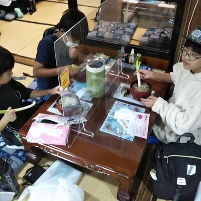 6年生は現在、昼食の「葱蕎麦」を食べています。「葱蕎麦」といえば、大内宿の名物です。みんな上手にネギを箸にして食べています。