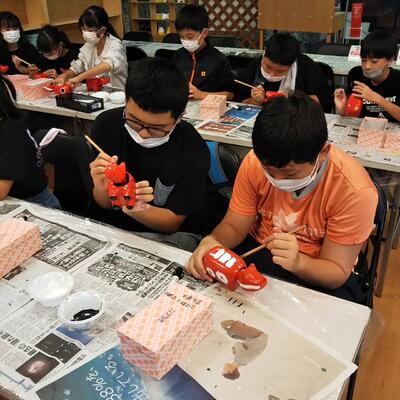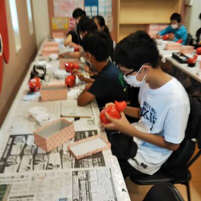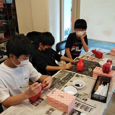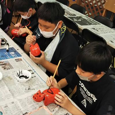 6年生は会津若松に到着し、赤べこの絵付体験を行っています。真剣に、世界に一つだけのオリジナル赤べこを作っています。
