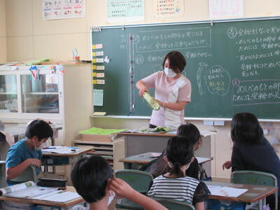 5年生は、理科の授業、受粉についての学習でした。最後に、受粉の結果できたヘチマの実を確認していました。昨年収穫し、乾燥させた実も観察しましたが、大きな実がなるんですね。