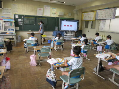 令和4年9月15日(木)、1年生は算数の授業、「くふうしてかぞえよう」の学習です。たまごやトマトなど、日常的に目にする物についての問題をブロックを使ったり、図を書いたりして、くふうして数えていました。