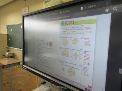 6年生は算数の授業、「円の面積について振り返ろう」の学習です。一見難しそうに見える図形も、分割したり、移動させることにより、簡単に解決できるようです。また、タブレットを使って、問題練習も行っていました。