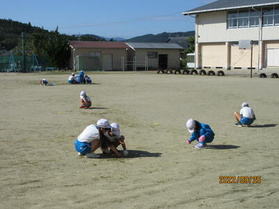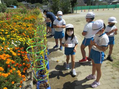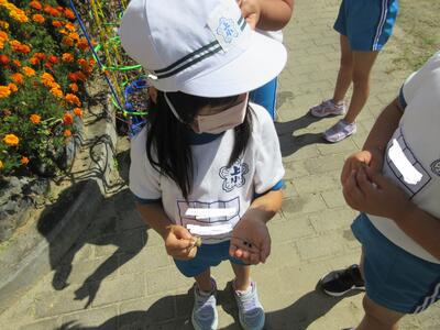 令和4年9月16日(金)、1年生は生活科の授業、朝顔の種をとっていました。この後、教室で観察するそうです。「たくさんとれたよ。」「お家に帰って、まきたい。」と、うれしそうでした。