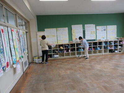 学校では、教職員は通常勤務ですので、授業の準備や各教室・特別教室の環境整備、作品の展示などをしています。