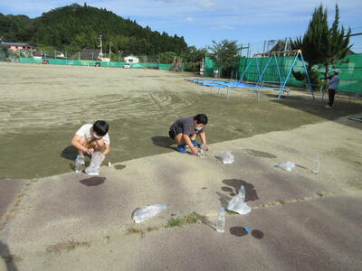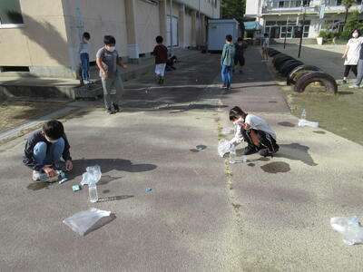 令和4年9月21日(水)、科学クラブで、バブロケットの実験をしていました。カメラのフィルムケースに水とバブを入れてふたをして地面に置きます。しばらくすると炭酸ガスが充満し、ケースが高く上がりました。子どもたちは、水やバブの大きさをくふうし、楽しみながら何度も行っていました。