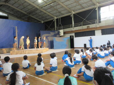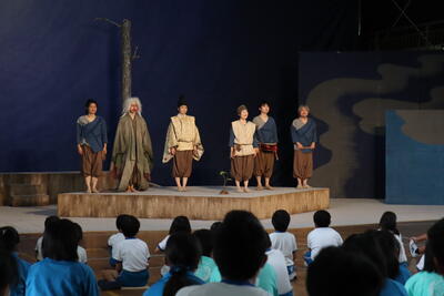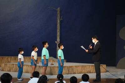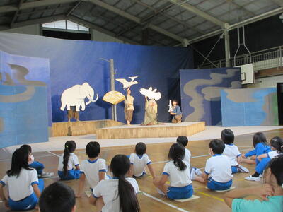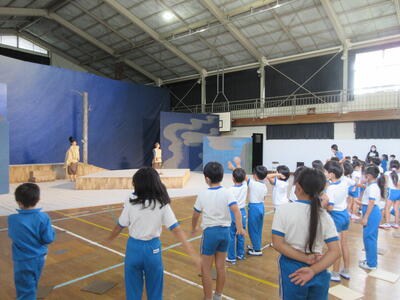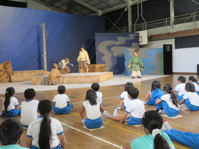 公演した作品は、劇団風の子関西による「風の少年シナド」でした。子どもたちは、全国の小学校を中心に公演しているプロの演技に引き込まれ、自然や命について考えることができたようです。最後に、代表児童から、感動した場面や感染防止対策をしながら鑑賞できたお礼を伝えました。全校児童の大きな拍手で鑑賞教室を終えることができました。